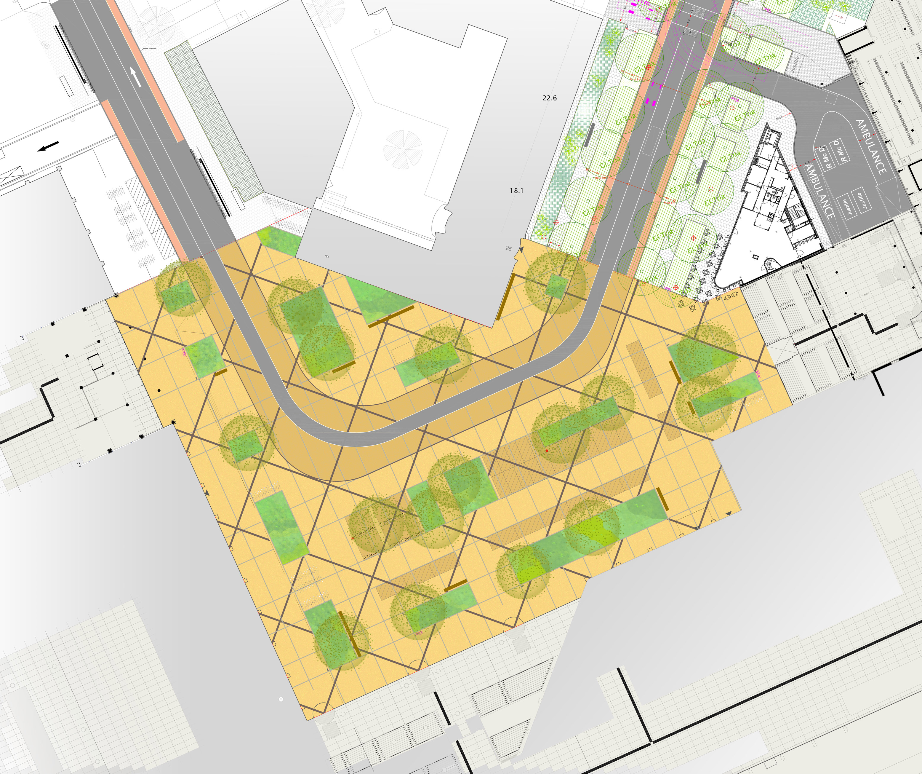 Recreating the Erasmus Medical Center also brought a new square in the city. This square is both the public address, the place to take and bring your family member and an important outdoor space for relaxing and sitting in the sun. Since the entry of the Metro and the bus stops are next to the square there is a natural dominancy of pedestrians. To support this and to make sure the square is used as a place to stay we have introduced the concept of “shared space” by giving it an yellow-red-amber brick carpet with 8 big maples trees and sturdy green planters. On the most prominent place an old sculpture of Gust Romeijn gives it an attractive special feature.