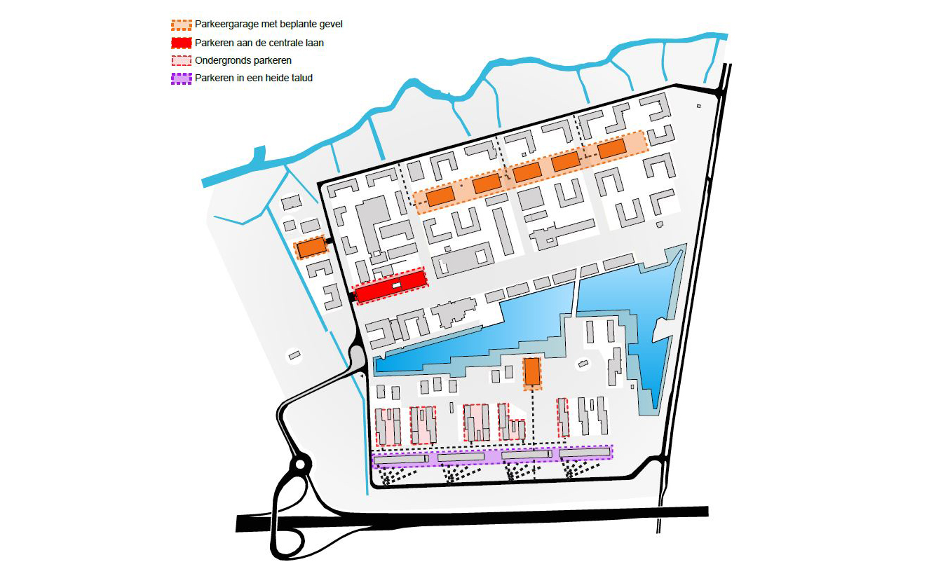 The strong natural character can only be realized by using minimum of pavement on ground level and therefore the parking places have to be accommodated in built parking facilities. The car parks in the northern part and central to the pond are built as ‘green boxes’ with an overgrown façade.
