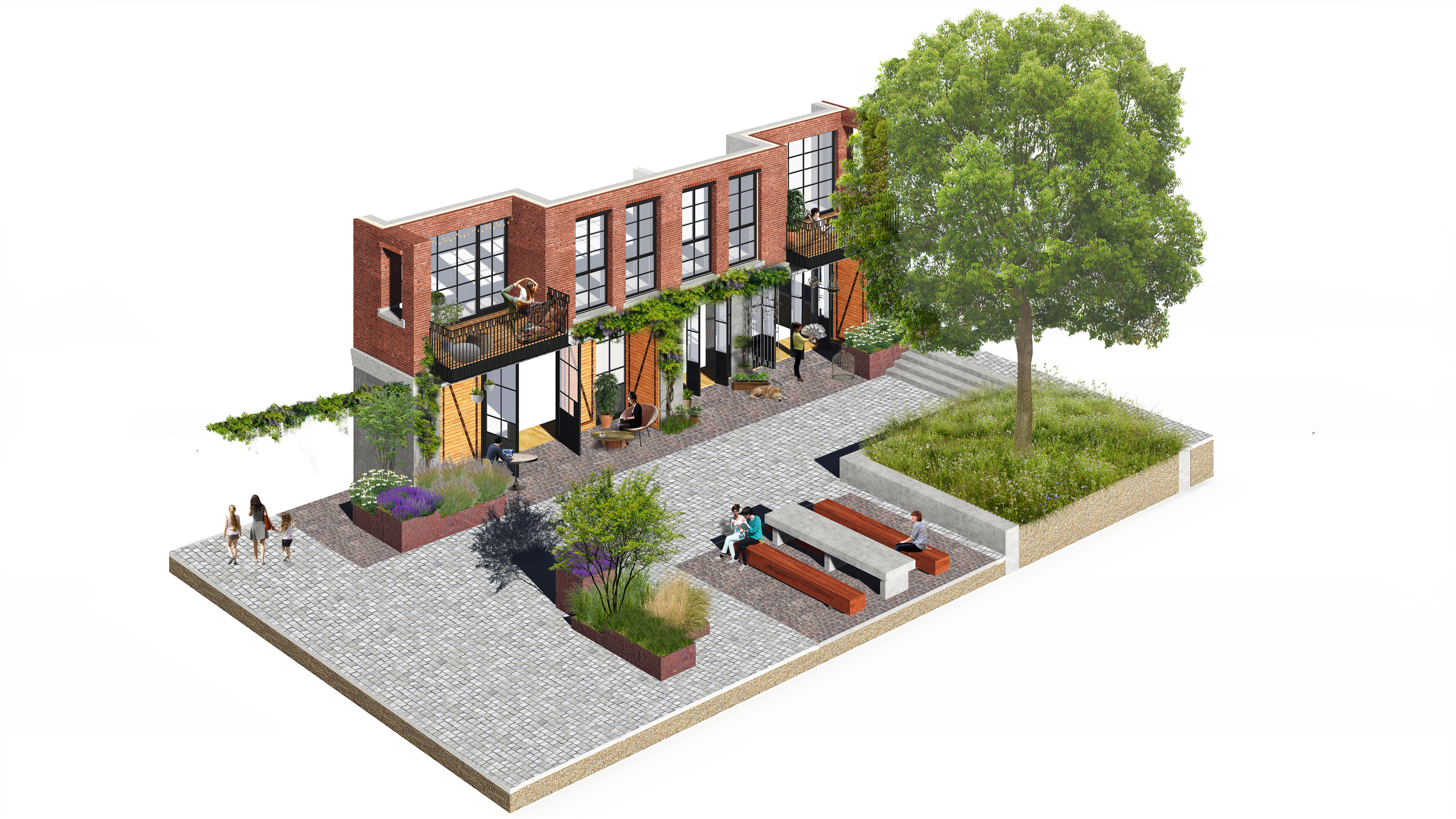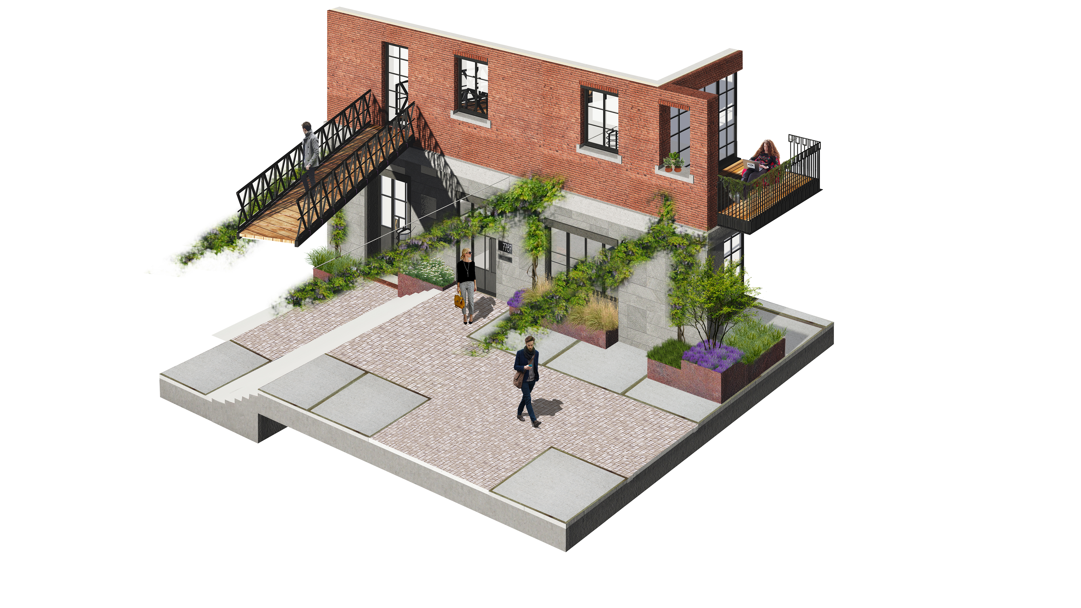 The outdoor space is green with a rough no-nonsense language, in which concrete and recycled cobblestones determine the atmosphere. The enormous amount of plants on the ground level - along and on the facades, between the buildings and on the roof terraces form a nice counterpart to the brick and concrete.